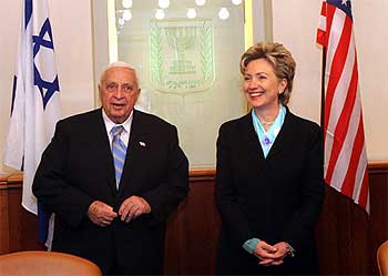 El camino hacia la Casa Blanca pasa por Jerusalén: el entonces primer ministro israelí, Ariel Sharon se reúne con la senadora Hillary Clinton en Jerusalén, noviembre de 2005. (InbalRose/ MaanImages)