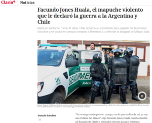 A la campaña anti-indígena se sumó el diario Clarín, con un extenso artículo anunciado en tapa el domingo 22 de enero y doble página interna. “Facundo Jones Huala, el mapuche violento que le declaró la guerra a la Argentina y Chile”, fue el título, firmado por Gonzalo Sánchez. Cita en seis oportunidades voces oficiales del Ministerio de Seguridad de Nación, Cancillería y Secretaría de Seguridad. Todas voces en “off”, sin nombre ni apellido, que acusan al Lof Cushamen de hechos tan insólitos como ajenos a la realidad. Según Clarín: