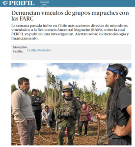 “Denuncian vínculos de grupos mapuche con las FARC (Fuerzas Armadas Revolucionarias de Colombia)”, tituló el diario Perfil el domingo 8 de enero en un extenso artículo, referido al conflicto del Lof (comunidad) Resistencia Cushamen con la empresa Benetton. La nota, firmada por Cecilia Moncalvo, acusa: “A medida que aparecen más datos, la acción de (Facundo) Huala y su grupo puede ser leída como el germen de una forma violenta de protestar y de hacer política. Hay datos, como que en zonas limítrofes la Gendarmería envió más personal, mientras que diputados chilenos y periodistas y productores argentinos mencionan a las FARC colombianas como parte de la financiación del grupo (…). Abre interrogantes sobre una zona liberada previamente y de tráfico de armas de Argentina a Chile. Facundo Jones Huala sería el nexo”.