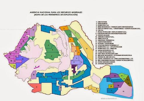 En Rumanía, tras 20 años de saqueo capitalista, ya no quedan apenas territorios libres para que los rumanos exploten directamente sus recursos naturales. Como se ve en el siguiente mapa de la Agencia Nacional para los Recursos Minerales, desde el golpe de estado capitalista los recursos que antes de 1989 eran propieda social y colectiva de los trabajadores rumanos se entregaron a diferentes corporaciones mafiosas, de las que actualmente solo una, RomGaz, en proceso de privatización, todavia es de propiedad estatal (aunque, como sabemos, en una dictadura del capital el propio estado está en manos de los capitalistas, y no de los trabajadores).