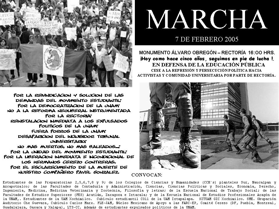 La Marcha que saldrá del Monumento de Álvaro Obregón a Rectoría este 7 de febrero del 2005, a las 4 de la tarde.