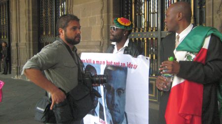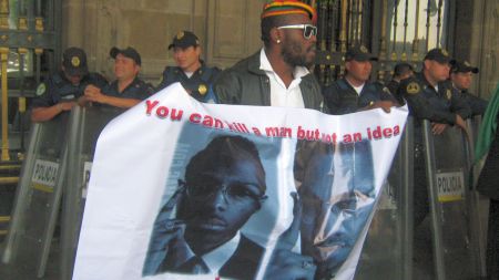El presidente del CCDNAM Wilner Metelus dice: “Ahora estamos afuera de las oficinas del Gobierno del Distrito Federal porque todavía no hay respuesta sobre la muerte de Malcolm Latif Shabazz, nieto de Malcolm X. Solo atraparon a dos meseros, los cuales se encuentran en el Reclusorio Oriente y faltan 3 personas más, de las cuales no se ha sabido nada”.