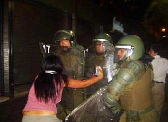 Una joven, la compañera del hijo de Rosa –al que están deteniendo policías de Investigaciones de Chile- intenta defenderla mientras sostiene a su wawa en los brazos, la wawa llora a gritos, los agresores amenazan y tironean a la joven, le fracturan el pulgar…