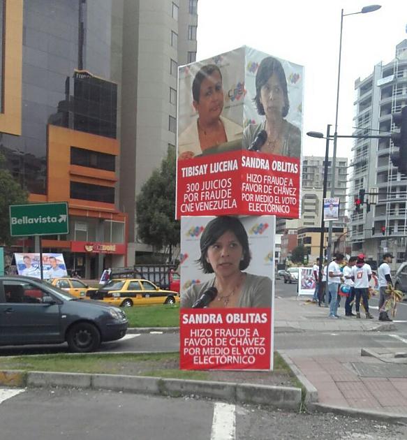 Las imágenes que acompañan esta nota son aleccionadoras. Están instaladas justo enfrente de las oficinas del Consejo Nacional Electoral, el organismo encargado de administrar los comicios. Como la candidatura del banquero Guillermo Lasso carece de una propuesta creíble a favor de las clases y capas populares ecuatorianas –son muchos los que aquí recuerdan lo ocurrido en la Argentina con las promesas de Mauricio Macri- recurren a la mentira y la difamación. Allí están Piedad Córdoba, Ernesto Samper, Tibisay Lucena y Sandra Oblitas exhibidos cual si fueran unos salvajes terroristas que con su accionar habrían asolado Venezuela y que amenazan con hacer lo mismo en el Ecuador en caso de que Lenin Moreno se alce con la victoria.