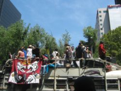 En el transcurso de la marcha hacia el Ángel, varios contingentes hicieron uso de un megáfono para gritar consignas o anunciar eventos. Desde el Chebús, con un gran dragón encima, se hizo una invitación a los manifestantes a participar en unas actividades de resistencia contra la reunión G-20 en México el 18 y 19 de este mes: http://g99vsg20.wordpress.com/carteles-volantes-posters-flyers/